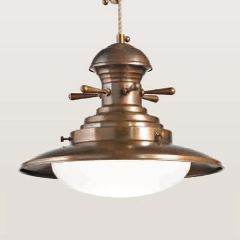 Messingist valmistatud meremärkide rippvalgusti Baia Kapten ahoi! Kaunis Baia rippvalgusti kutsub teid unistama avamerest ja purjelaevadest horisondil. See on disainitud laiaulatusliku messingist lambivarjuga ja kauni valgete mattklaasist lambikorpusega. Pesa ümber on väike ornament, mis meenutab rooli. Riputusest ripub väike ankur, mis meenutab purjetamisköitsena. Merevalgusti kiirgab heledat valgust ja annab hea, pimestusvaba ruumivalgustuse. Oma atmosfäärilise väljanägemisega võib Baia aidata kaasa meeleoluka elustiiliga ning sobib kasutamiseks ka merendus- ja kalandusromantikaga toitlustusasutustes. Baia rippvalgusti on käsitsi valmistatud ja pärineb Itaalia valgustitootjalt. Selle tootmist iseloomustab traditsiooniline valgustuskunst Veneetsias.