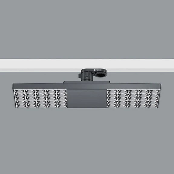 Jilly LED rihmavalgusti ERCO 230 V 3-faasilisele rööbasteele - 15 W LED, pööratava dimmeriga, eriti lai valgusjaotus (82°) Jilly rihmavalgusti on mitmekülgne seadmevõimalus otsese töövalgustuse jaoks kontorites tänu otse seadmes või väljastpoolt dimmerdatavusele, eriti laiale valgusjaotusele ja heale pimestuse kontrollile. Iseloomuliku valgusemissiooni tagavad optilisest polümeerist valmistatud spetsiaalne läätsesüsteem ja timmimisraja. Adapteriga paigaldamine (pööratav 360°) 230 V rööbasteele võimaldab valgustit vastavalt vajadusele liigutada. Valgustugevuse reguleerimiseks on otse valgusti peal pööratav reguleerija, samuti saab kasutada väliseid dimmereid - Pimestusvastane ripp: plastist, alumiiniumiga kaetud, hõbedane, kõrgelt peegelduv - Koos rööbasteeadapteriga ERCO 3-faasilise rööbastee, Hi-trac 3-faasilise rööbastee ja 1-faasilise pistikupesa jaoks - Standardi kohane pimestusjuhtimine ekraanitöökohtadele: UGR < 19 - ühendatud koormus: 19 W - dimmerdatava ERCO juhtimisseadmega - dimmerdatav valgusti pöördregulaatoriga või välise dimmeriga (faasi väljalülitus)