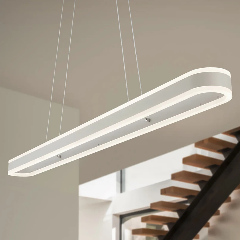 Moodsa disainiga timmitav Liv LED rippvalgusti Liv LED rippvalgusti annab heleda valgustuse söögilaua või köögis asuva laua või töölaua kohal. Pikk ovaalne satineeritud akrüülist lambivarju on varustatud soojade valgete, üles- ja allapoole säravate valgusdioodidega, mille heledust saab reguleerida integreeritud, timmitava LED-muunduri abil, mille eesmine või tagumine faasihämardaja (ei kuulu komplekti). Akrüülist hajutit kaunistab keskel olev metallriba. Nelja terastrossiga riputus nurgakujulisel katusel täiendab valgusti moodsat välimust.