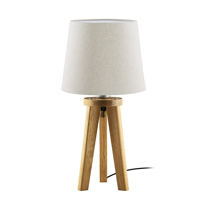 Elli kolmjalgne laualamp puidust raami ja kangast varju Ajatu disain, oskuslik käsitöö ja tähelepanu detailidele käivad Elli laualambi puhul käsikäes. Raam koosneb kolmest puidust jalast, millest ühel on kanal toitekaabli jaoks. Matist harjatud nikkelist korpuses olev pesa asub ajatu tekstiilvarju sees, mis on kujundatud vertikaalselt avatud koonusena ja annab lauavalgustile eriti hubase ilme - FSC-sertifikaadiga tarnijatelt pärit jätkusuutlikust puidust - Valmistatud Saksamaal