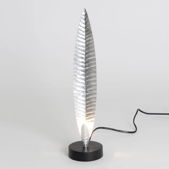 Ebatavaline Penna lauavalgusti hõbedase lehekujulise varjundiga Seda lauavalgustit saab kasutada küljelaudade, öökappide ja kappide kaunistamiseks rõhutava lisavalgusallikaga. Absoluutne pilgupüüdja ruumis: pruunimustast alusest sirutub ülespoole pikk leht, mille hõbedane läige rõhutab valgustust muljetavaldavalt ja annab samal ajal kasutatud G4-pirni poolt kiiratavale valgusele erilise sära. Sobivad valgusallikad on saadaval lisatarvikutena.