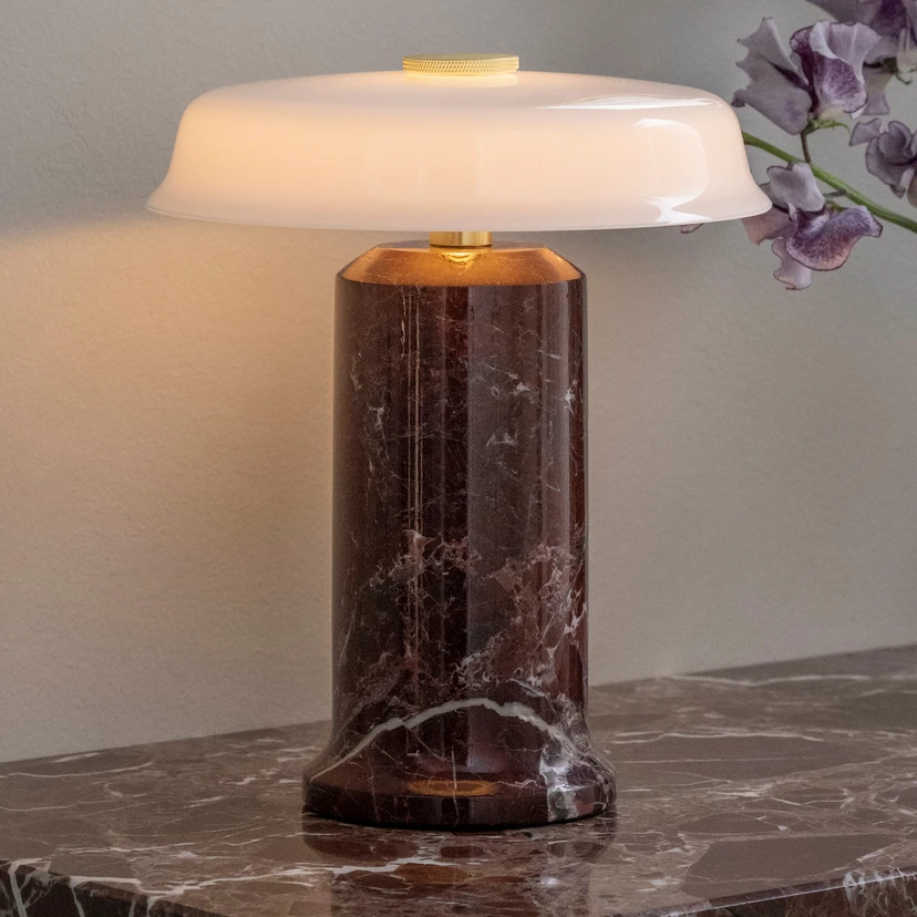 LED-akutoitel laualamp Trip No. 2, burgundipunane/valge, marmor, klaas