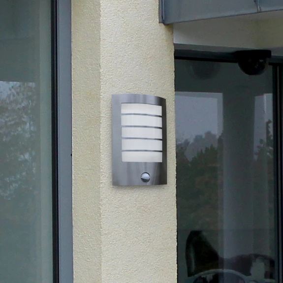 LED-seinavalgusti Slim liikumis- ja hämarusanduriga, IP44 Roostevabast terasest LED-seinavalgusti Slim on varustatud soojade valgete valgusdioodidega. Samuti on integreeritud liikumis- ja hämarusandur. Saate määrata, kas see peaks olema aktiivne ka päevavalguses või ainult öösel. Samuti saab vastavalt vajadusele määrata valgustuse kestuse. Slim on pritsmeveekindlalt kaitstud ja seetõttu võib seda paigaldada ka välistingimustesse, näiteks fassaadile või välisukse kõrvale. Tehnilised omadused - Anduri tuvastamisnurk: 90° - Anduri ulatus: 4 kuni 7 meetrit (paigalduskõrgus 2 meetrit) - Saab valida pideva töö või hämaruse režiimi (ainult öösel aktiivne) - Valgustuse kestus tuvastamisel on seadistatav: 10 sekundit kuni 4 minutit - Pritsmeveekaitsega (IP44)