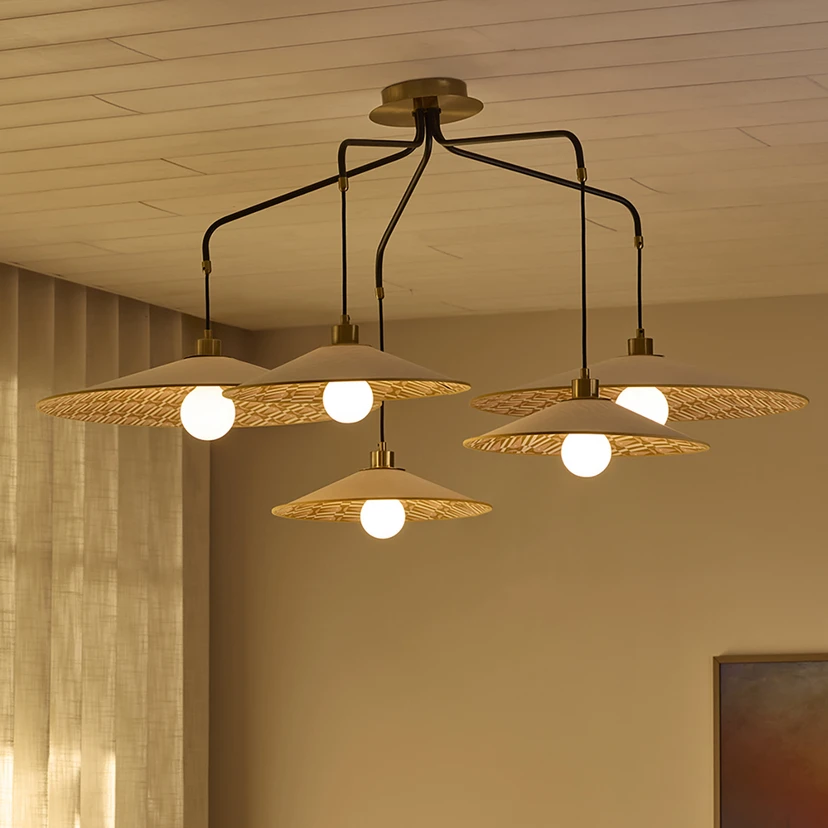 MARKET SETi viie lambiga riputatav lamp Gatsby ühendab stiilse esteetika ja kvaliteetse viimistluse. Viie erineva suurusega varjuga, mis on väljastpoolt kreemikarva ja seestpoolt kreemika, helepruuni ja aprikoosikarva efektse mustriga, sobib see eriti hästi disainile orienteeritud eluruumide kontseptsioonidesse. Tekstiili ja metalli kombinatsioon annab lambile ajatu elegantsi, mis loob nii söögitoas kui ka elutoas erilise atmosfääri.