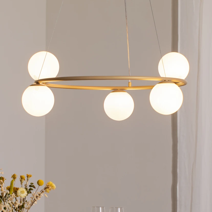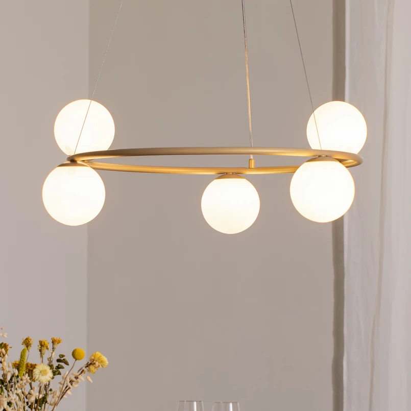 5-lambiline riputitav lamp Gama võlub oma harmoonilise kombinatsiooniga kvaliteetsest terasest ja elegantsest klaasist. Kuldne ja opaalne värvitoon annab igale ruumile luksusliku atmosfääri, samas kui viis valgusallikat tagavad ühtlase ja meeldiva valgustuse. See lamp sobib ideaalselt elutoasse või söögituppa ning lisab sisekujundusele stiilseid akente.