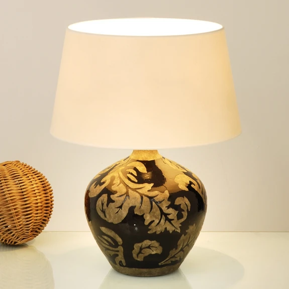 Pilkupüüdja igas ruumis - ümmargune Toulouse'i laualamp See laualamp on igas ruumis esiletõstmiseks; lambi alus on valmistatud keraamikast, sellel on imeline muster ja see on glasuuritud. Tekstiilist lambivarju on silindrikujuline ja kujundatud trendikas värvuses écru, nii et see särab valguse korral eredalt. See valgusti on pilkupüüdev aksessuaar igas eluruumis ja peaaegu igas interjööris, kiirgades meeldivat valgust.